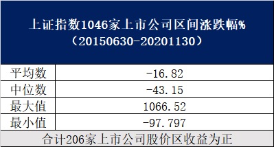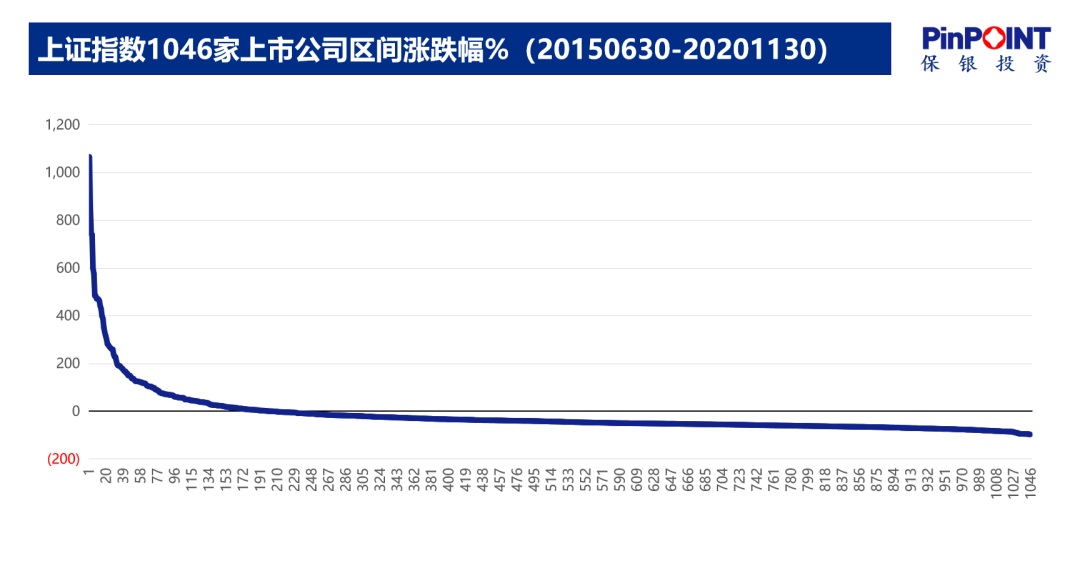 我们做这样一个统计:计算上证指数从2015年6月30日至2020年11月30日,所有上市公司的涨跌幅。剔除2015年6月30日之后成立的上市公司和已经退市的上市公司后,合计为1046家。