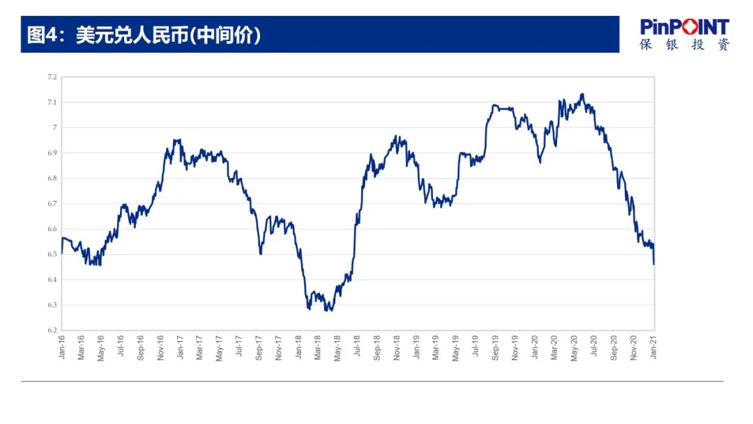 国际疫情不停,人民币升值不止。我们预计人民币升值趋势在一季度会继续(图4)。当前,人民币升值的重要原因是全球生产能力因疫情导致的供应链断裂而不能满负荷运转,新一轮疫情的加重会使得中国的出口保持强劲,从而支撑人民币进一步升值。疫情好转后,中国的出口增速会有所放缓,减轻人民币的升值压力。
