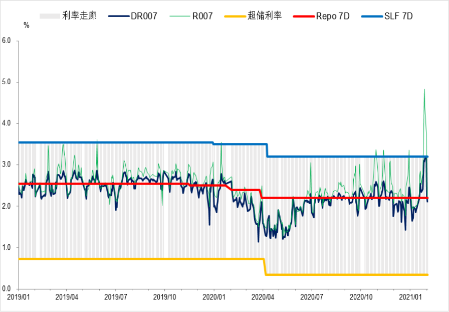 1月份的金融市场发生了两个重要事件。在美国,散户主导的逼空行动导致资本市场出现波动。在中国,央行提出对股市和房市的泡沫风险有所担心,货币政策有所转向,市场利率一度上升到了近年的高位(图一)。