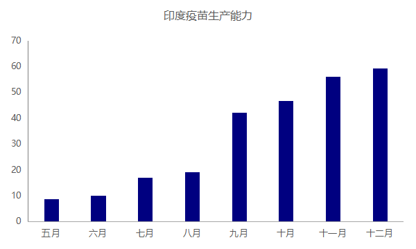 印度和东南亚的疫情可能使得中国出口在三季度保持强劲,这一影响可能到四季度才会逐渐减弱。印度疫情当前面临的主要挑战是疫苗供给不足。未来半年,印度政府预计疫苗生产将逐步提速,从5月份的8800万剂提高到9月份的4.2亿剂(图一),从而保证印度城市居民大部分可以接种疫苗。这可能帮助印度和其他新兴市场逐步恢复生产能力,从而造成中国出口增速逐步走弱。