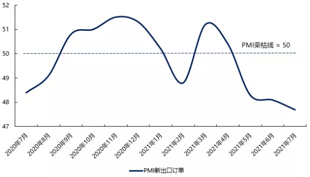 我们认为在未来几个月最大的宏观风险是疫情恶化和出口放缓同时出现,这将会使得宏观经济面临的风险显著上升。今年上半年中国经济面临的外需比疫情之前强,内需比疫情之前弱(图一);最近三个月,PMI指数中的新出口订单指数持续停留在50以下(图二),显示出口有可能会面临放缓风险。在这种情况下如果内需和外需同时下行,经济放缓的速度就会加快。当然在这种情况下,政府政策的边际放松步伐也会加快,但是放松的力度也许不会像去年那样大。