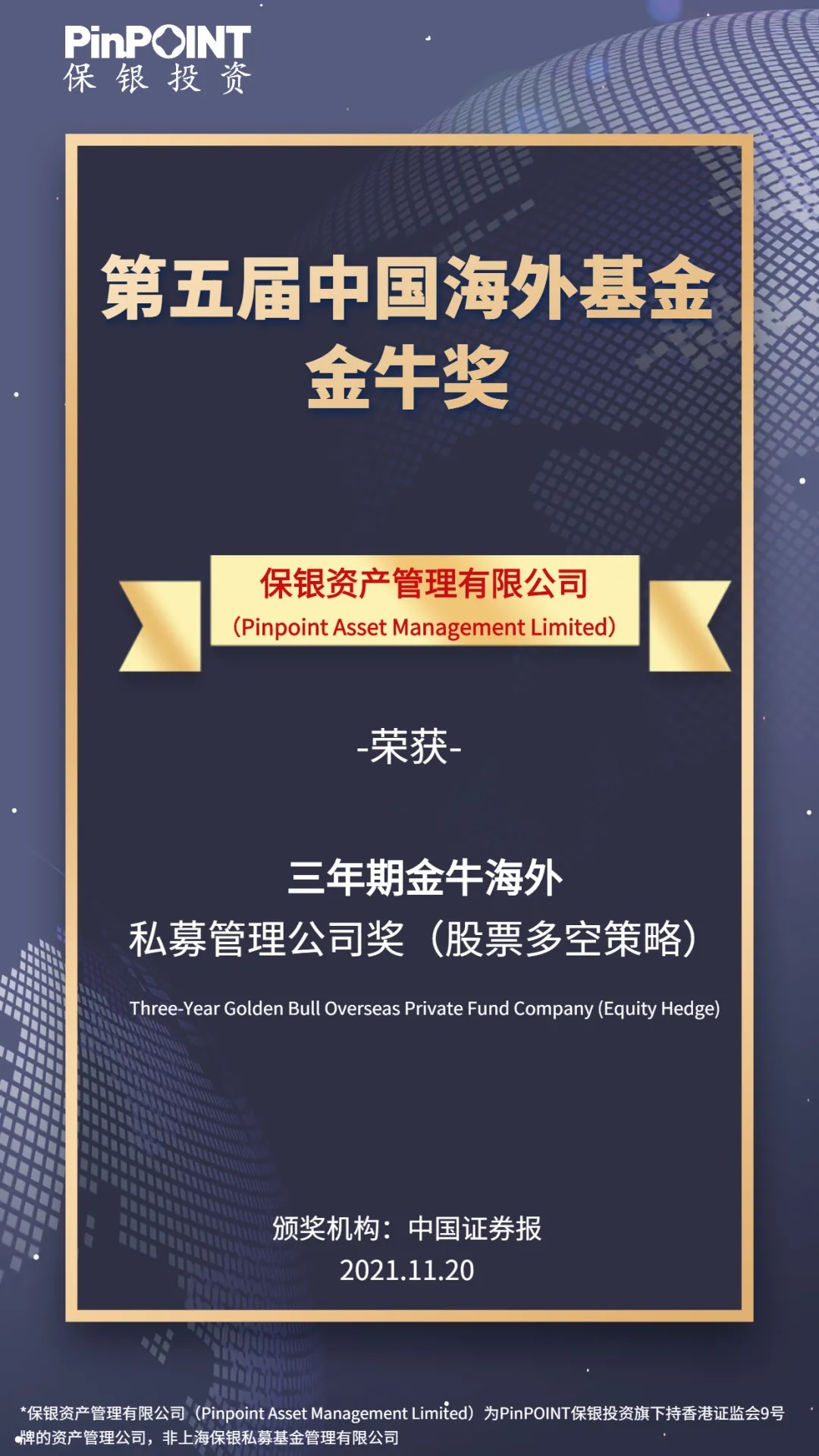 021年11月20日,由中国证券报主办的第五届中国海外基金金牛奖颁奖典礼在上海举行。保银资产管理有限公司(Pinpoint Asset Management Limited)投资实力备受肯定,斩获: