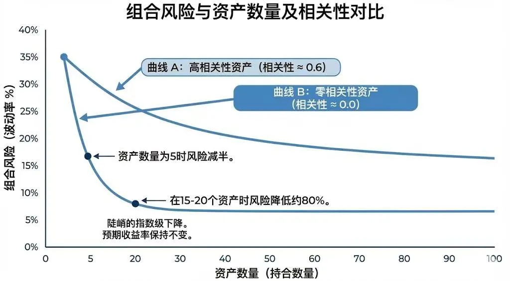曲线 B:零相关性资产(Correlation = 0.0) 这是“圣杯”显现的区域。 当我们向组合中加入回报逻辑互不相关的资产时,风险曲线呈现出陡峭的指数级下降。