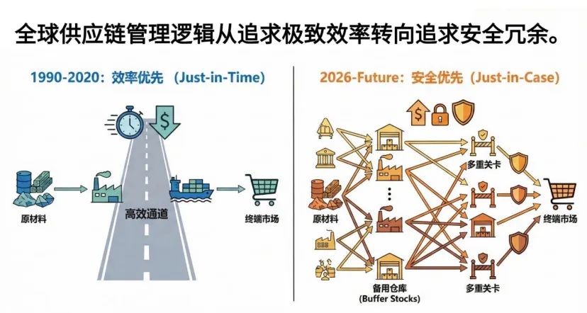 刚刚闭幕的2026年冬季达沃斯论坛,向全球资本市场传递了一个明确的信号:过去三十年主导全球经济治理的底层逻辑正在发生根本性转折。与以往强调无国界商业与极致成本效率不同,本届论坛的核心议题频繁围绕“韧性”、“去风险”与“冗余建设”展开。这标志着全球供应链管理已正式从“效率优先”时代,彻底转向地缘博弈下的“安全优先”时代。