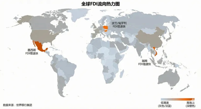 一是流向北美市场的近岸制造中心,以墨西哥为代表的拉美国家承接了大量高端制造业产能,以缩短对美出口的物理与政治距离。二是流向东南亚及东欧等“中间地带”,越南、匈牙利、波兰等国因其在地缘博弈中的相对中性或盟友地位,成为了供应链备份的首选地。