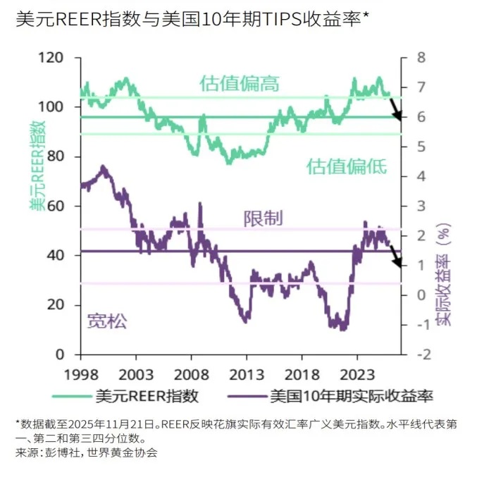 当前美元实际有效汇率(REER)处于“估值偏高”区间,且10年期实际收益率处于“限制”性区域。宏观重力的回归,迫使金价重新定价。