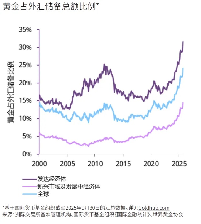 如下图所示,新兴市场(EM)央行的黄金储备占比仍远低于发达经济体。在地缘政治摩擦常态化的背景下,这种“追赶式”的配置需求构成了金价长期的坚实底座。