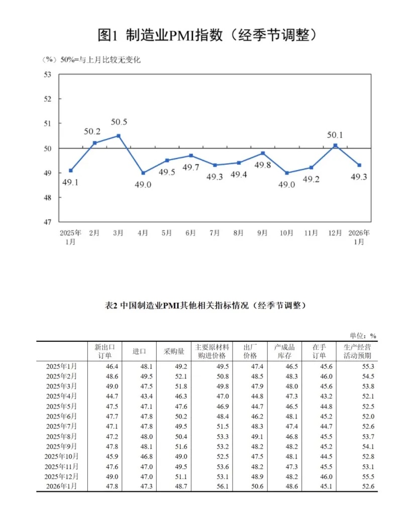 从历史数据看,1月份往往是制造业的传统淡季。加之2026年春节较晚(2月中旬),节前效应导致部分工业活动自然放缓。因此,49.3%的读数虽然低于荣枯线,但在统计学意义上并不意外。