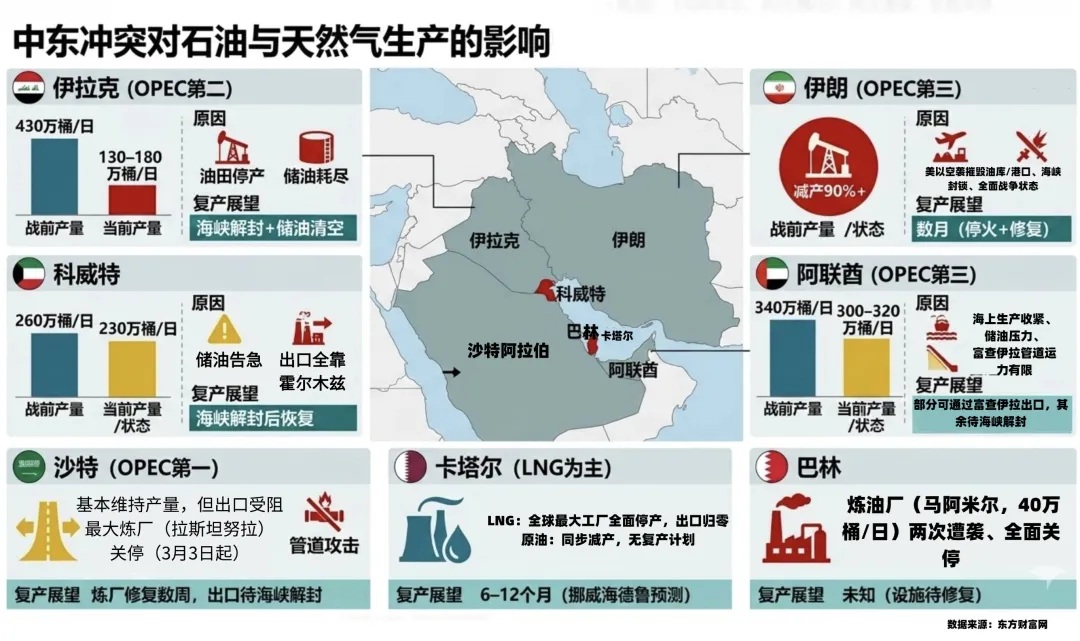 根据近期数据的推演,中东原油主产国的实质性减产幅度惊人,合计减产或已最高达到670万桶/天,这接近全球原油总产量的7%。这种量级的供给侧真空,直接导致能源价格暴力拉升。