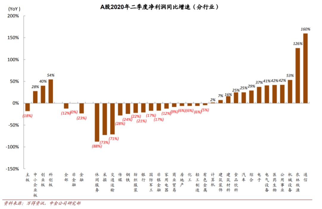 宏观形势的好转在上市公司的业绩上也得到了验证。A股上市公司二季度盈利同比增速相较一季度跌幅明显收窄,非金融回升至零增长附近。全部A股/金融/非金融二季度增长-12%/-23%/0%(对比一季度增速-23%/-1%/-51%)。结构上,上游行业负增长幅度明显收敛,中下游板块部分行业已经在二季度转为单季正增长;科技类公司受益于产业景气度上行二季度业绩增速较快回升,如通信、电子、计算机板块二季度增速均转为正增长;在“六稳六保”基调下部分中上游偏基建类企业业绩增速较快回升,如机械设备、电气设备、建筑建材、公用事业等;部分必需消费类或受益于疫情的板块盈利稳健增长,如食品饮料、医药等。