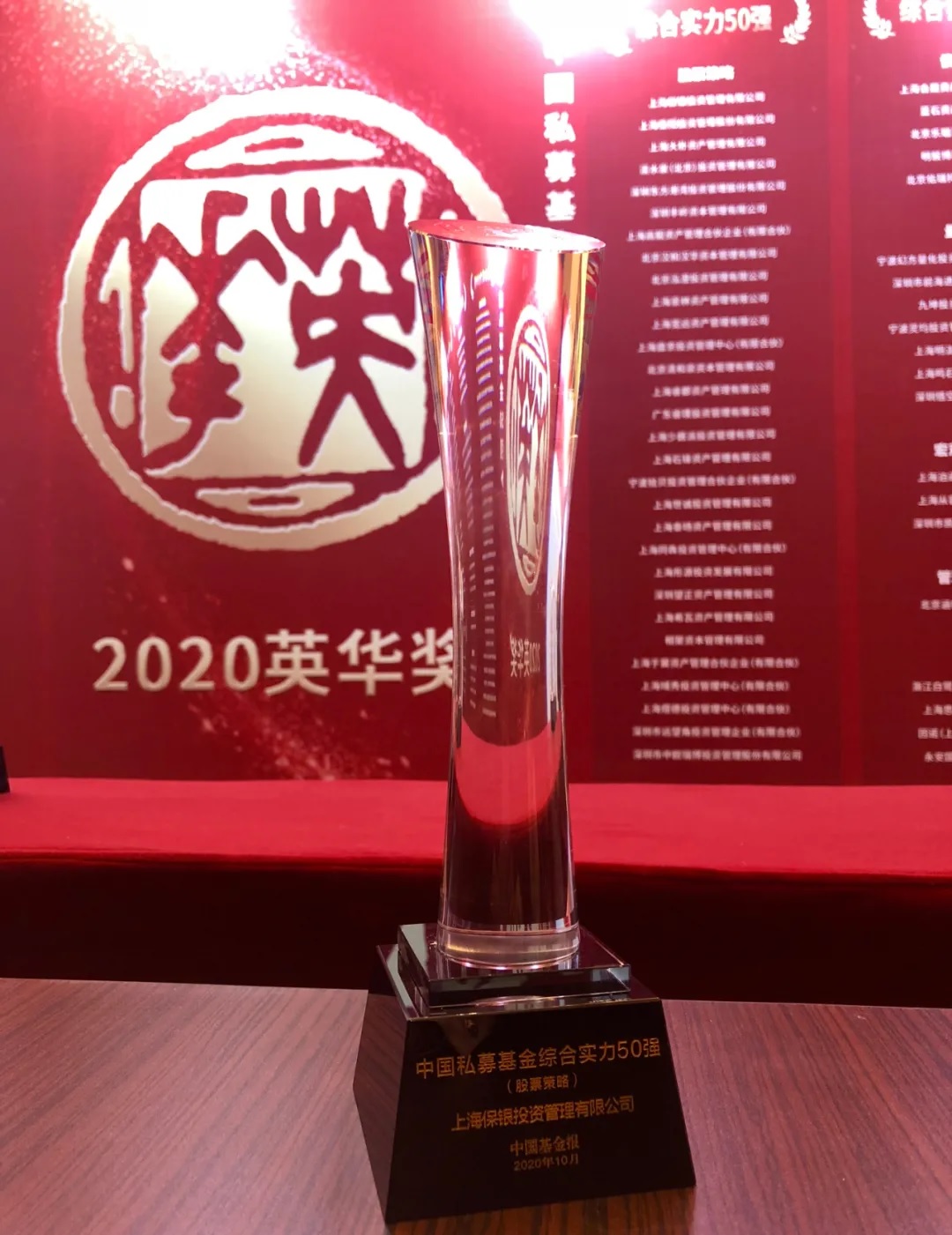 10月28日,由《中国基金报》主办的“2020中国私募基金英华奖”在上海隆重揭晓。凭借优秀综合实力,保银投资获评“英华奖中国私募基金综合实力50强”。